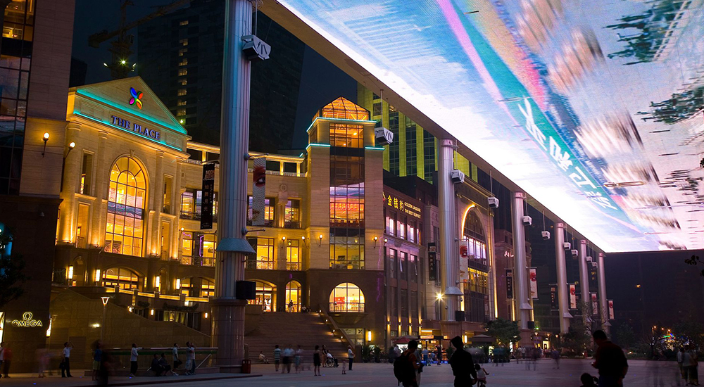 The Place (世贸天阶), Bắc Kinh không chỉ là trung tâm thương mại – nó là một biểu tượng thị giác! Với màn hình LED khổng lồ dài 250m trên trần phố đi bộ, nơi đây mang đến cảm giác như bạn đang lạc vào phim viễn tưởng.