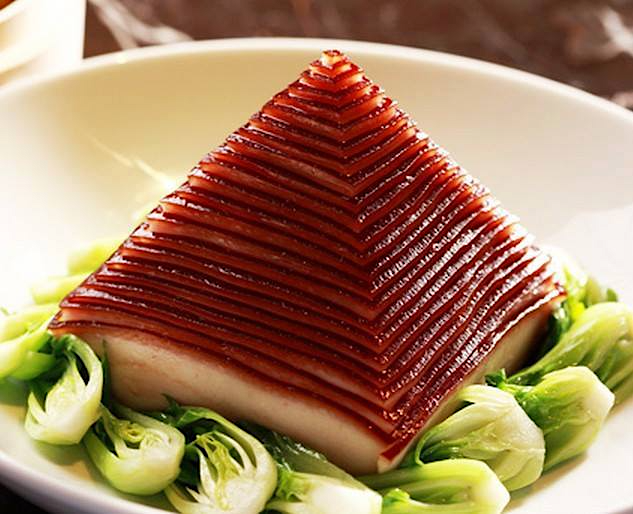 Ba chỉ heo được cắt vuông đều, xếp chồng như hình tháp, sau đó om chậm với nước tương, rượu Thiệu Hưng, đường nâu và gừng trong nhiều giờ liền. Khi dọn ra, từng lớp thịt bóng mượt, mềm tan – béo ngậy – thấm đẫm vị ngọt mặn hài hòa, nhìn là muốn ăn liền! Hình thức “kim tự tháp” khiến món ăn trở nên đặc biệt và rất bắt mắt – cực hợp để… chụp trước khi ăn!
