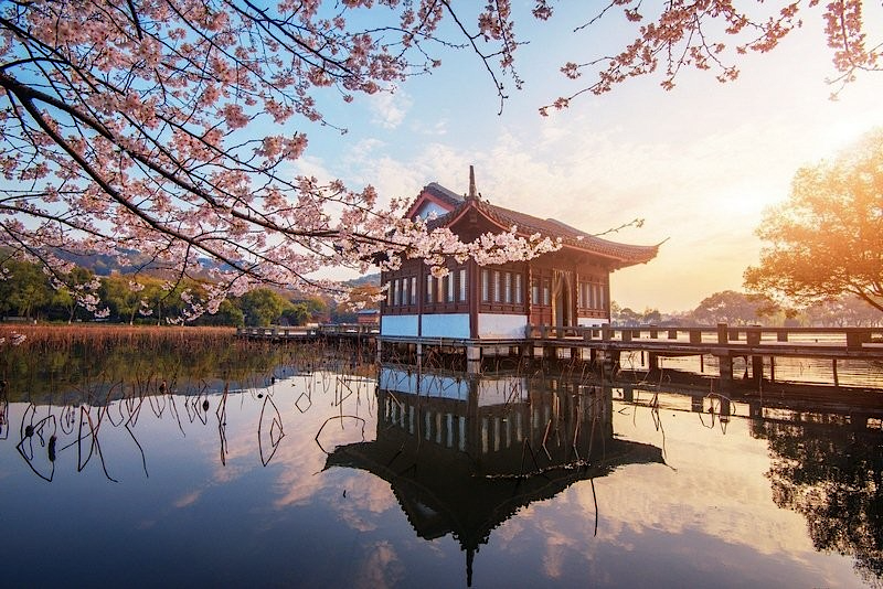 Nhắc đến Hàng Châu là nghĩ ngay đến Hồ Tây – nơi được mệnh danh là “trái tim” của thành phố. Với mặt hồ trong veo, lấp lánh ánh nắng, hàng cây anh đào rủ bóng lãng mạn, đây là địa điểm sống ảo không góc chết.