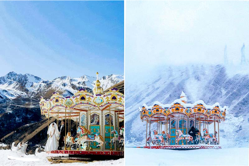 Ngoài các đường trượt tuyết và cabin gỗ lãng mạn, Gia Cô Sơn còn là thiên đường giải trí mùa đông với những hoạt động thú vị như mê cung tuyết, cánh đồng tuyết hồng, và đặc biệt là vòng quay ngựa gỗ giữa khung cảnh tuyết trắng như cổ tích – điểm check-in “hút hồn” nhiều du khách, đặc biệt là các bạn nữ.