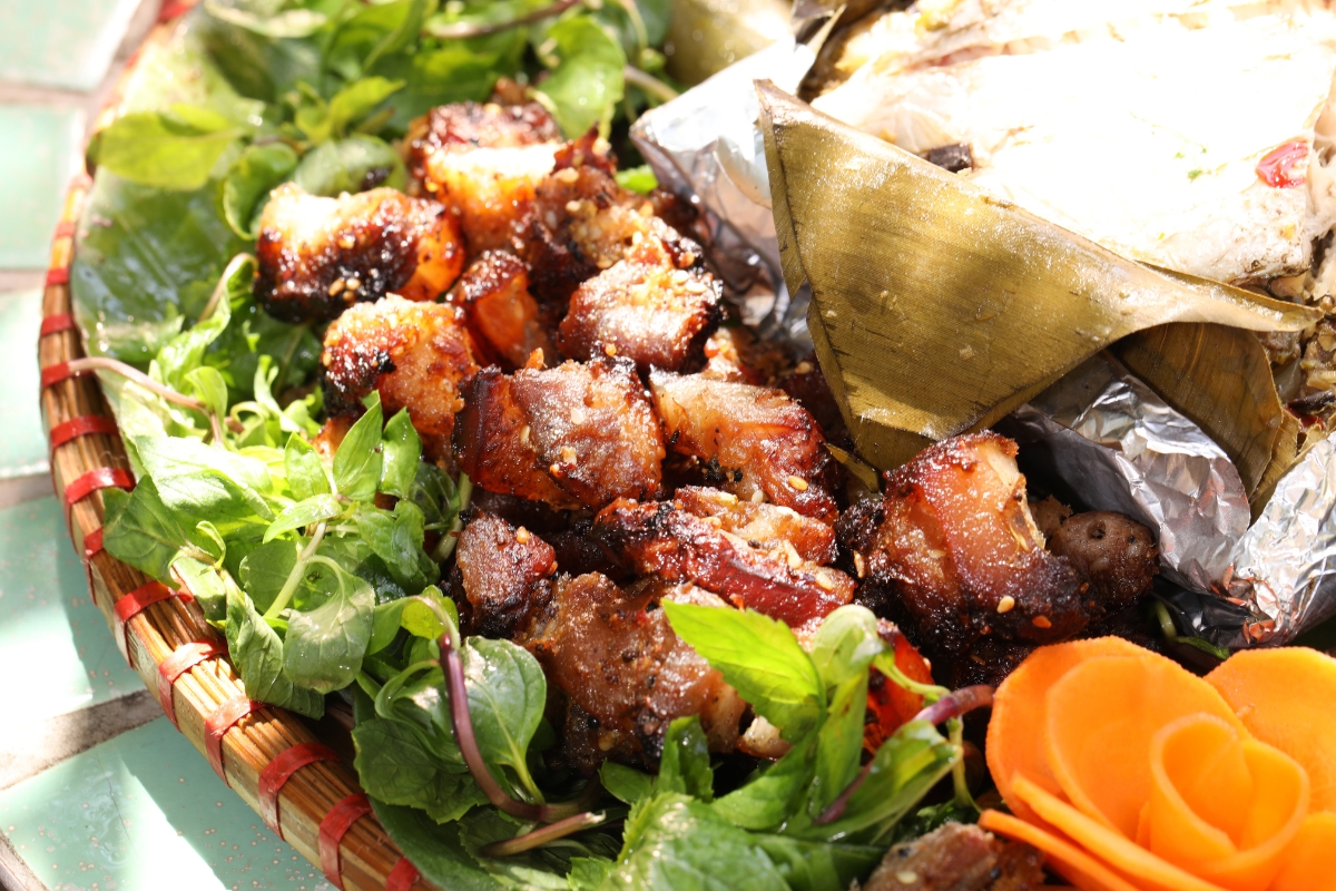 • A traditional dish of the Thai ethnic group, featuring freshwater fish marinated with wild herbs and spices, then wrapped in banana leaves and grilled to perfection.