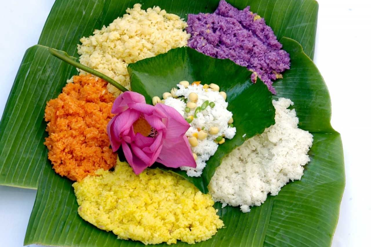 • Sticky rice is cooked inside bamboo tubes over an open fire, giving it a smoky aroma and subtle sweetness. Often served with grilled meats or a simple mix of salt and sesame.