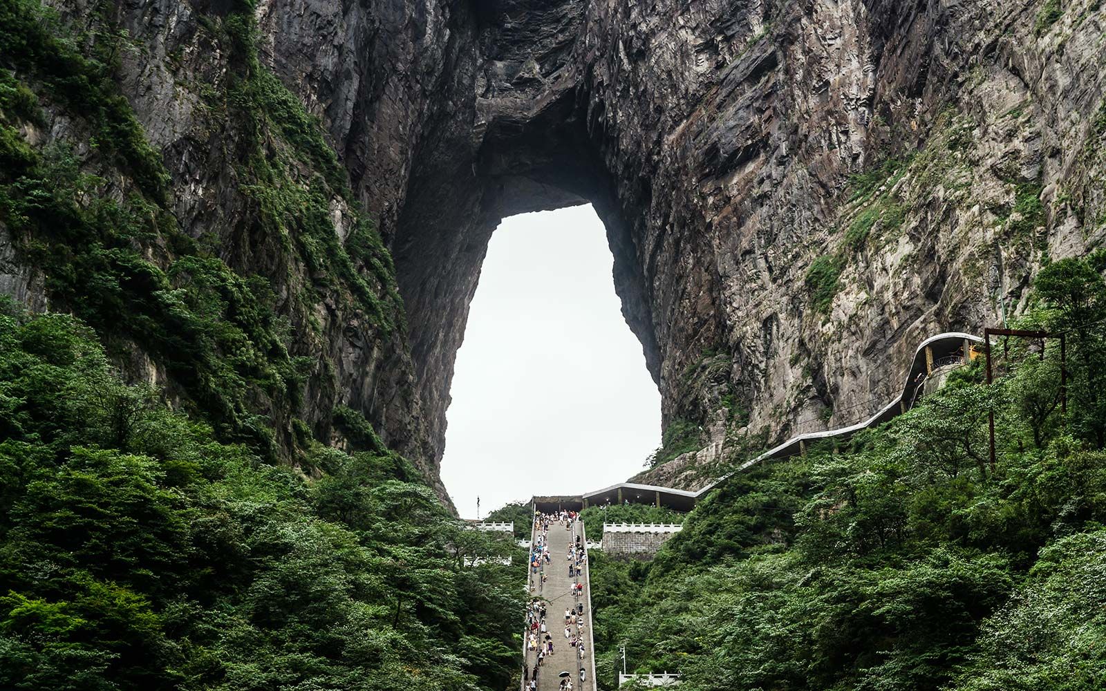 Cổng trời Thiên Môn Sơn là một vòm đá tự nhiên hùng vĩ cao hơn 131m, rộng 57m – được xem như “lối đi giữa trời và đất” linh thiêng của Trung Hoa.