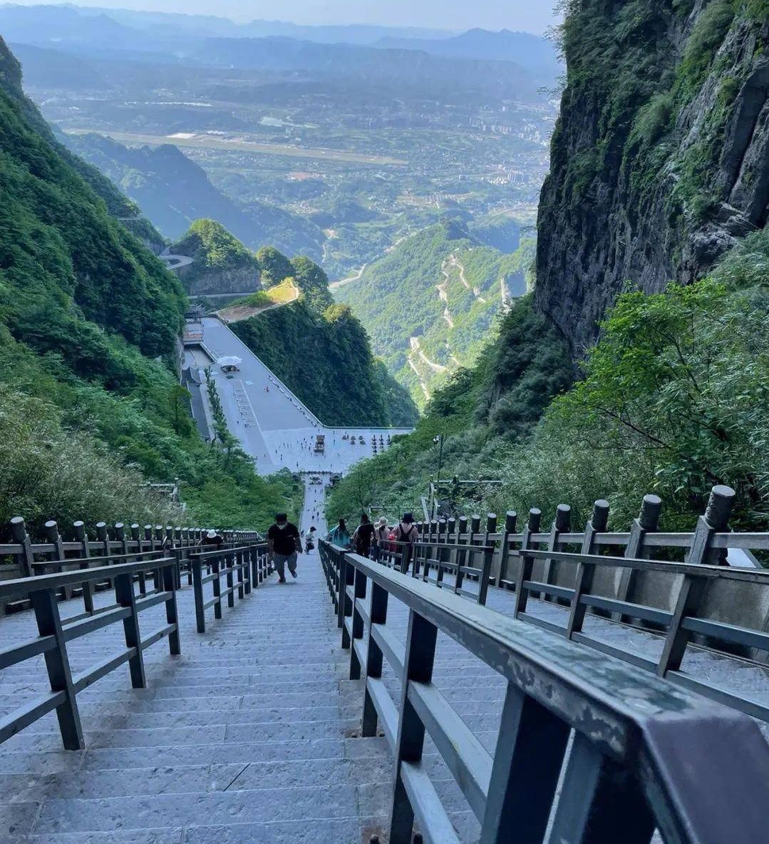 Bạn sẽ thấy toàn bộ con đường 99 khúc quanh uốn lượn như dải lụa trắng giữa rừng xanh – một trong những khung hình biểu tượng nhất của Thiên Môn Sơn. Khi trời trong, bạn có thể nhìn thấy cả thành phố Trương Gia Giới thu nhỏ phía xa xa.